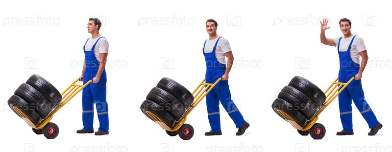 Ремонтник шин с троллейбусом, изолированным на белом