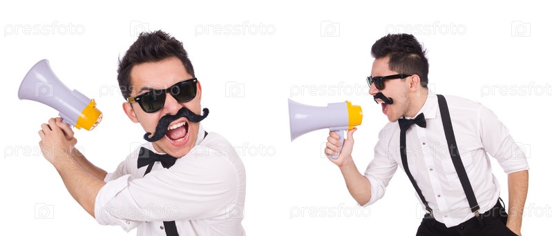 Эмоциональный мужчина с громкоговорителем, изолированным на белом