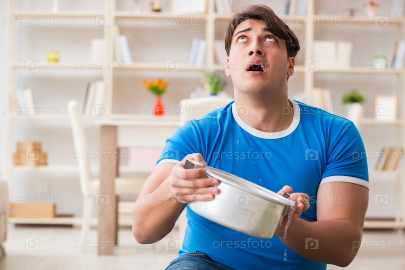 Мужчина дома, имеющий дело с соседней утечкой воды