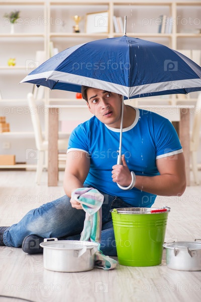 Мужчина дома, имеющий дело с соседней утечкой воды