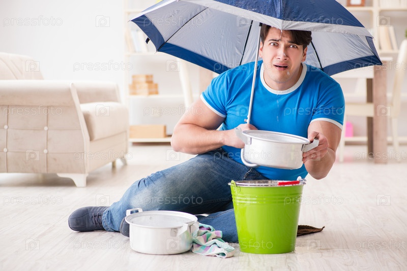 Мужчина дома, имеющий дело с соседней утечкой воды