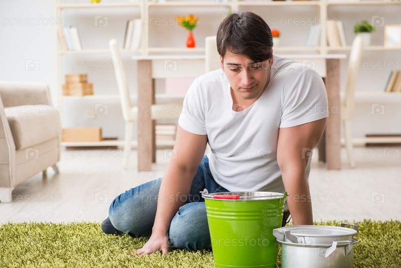 Мужчина дома, имеющий дело с соседней утечкой воды