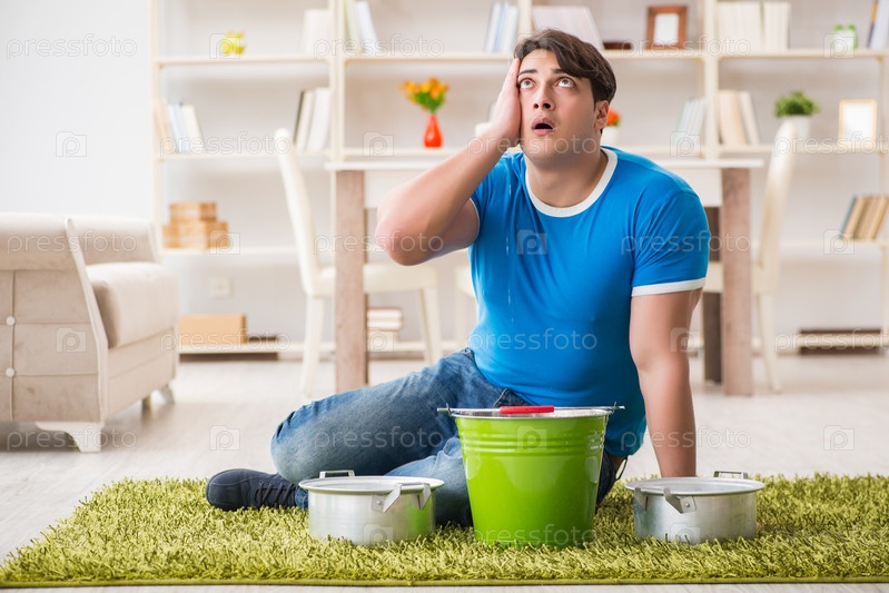 Мужчина дома, имеющий дело с соседней утечкой воды