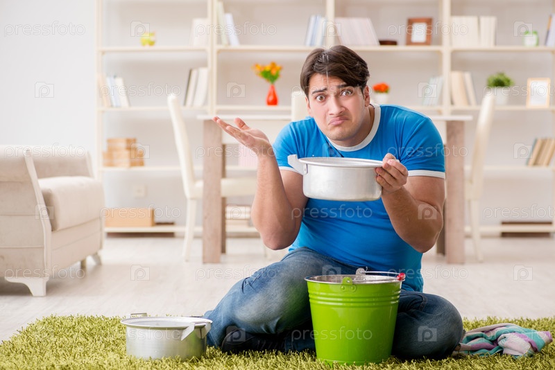 Мужчина дома, имеющий дело с соседней утечкой воды