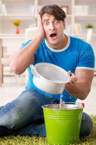 Мужчина дома, имеющий дело с соседней утечкой воды