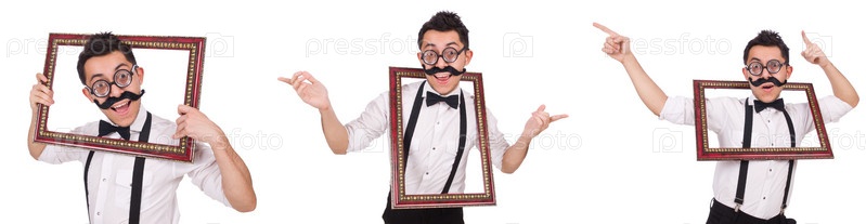 Молодой человек с рамой, изолированной на белом