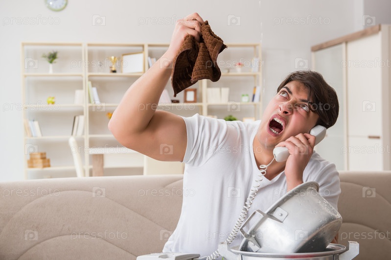 Мужчина дома, имеющий дело с соседней утечкой воды