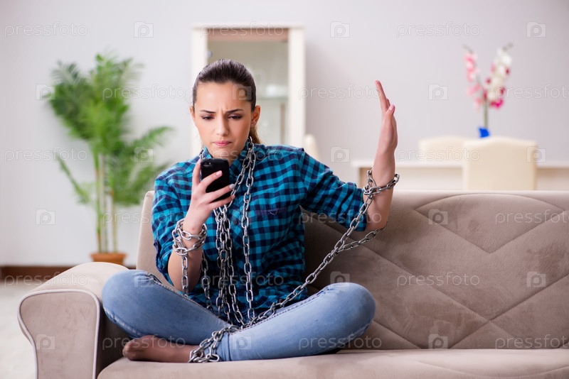 Молодая девушка, пристрастившаяся к мобильному телефону