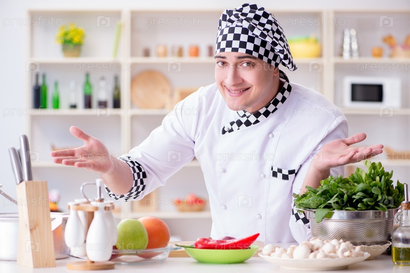 Молодой мужской повар работает на кухне