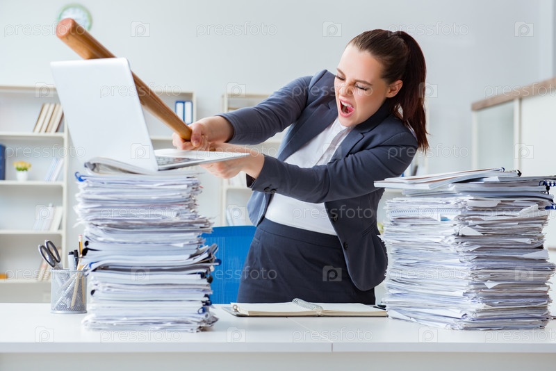 Разгневанная бизнесвумен с бейсбольной битой в офисе