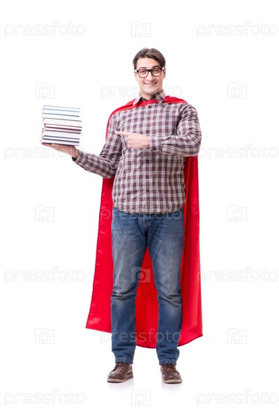 Студент-супергерой с книгами, изолированными на белом