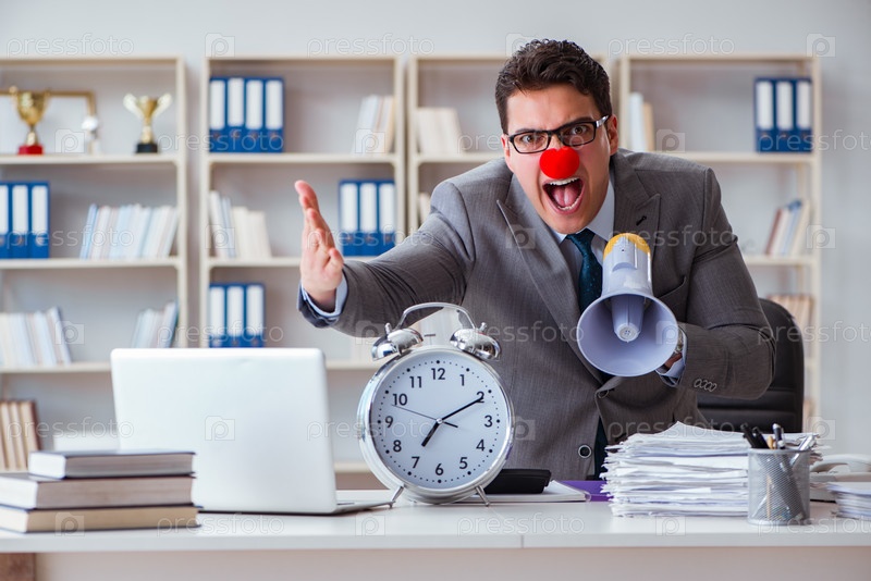 Бизнесмен-клоун в офисе злится, разочарован мегафоном