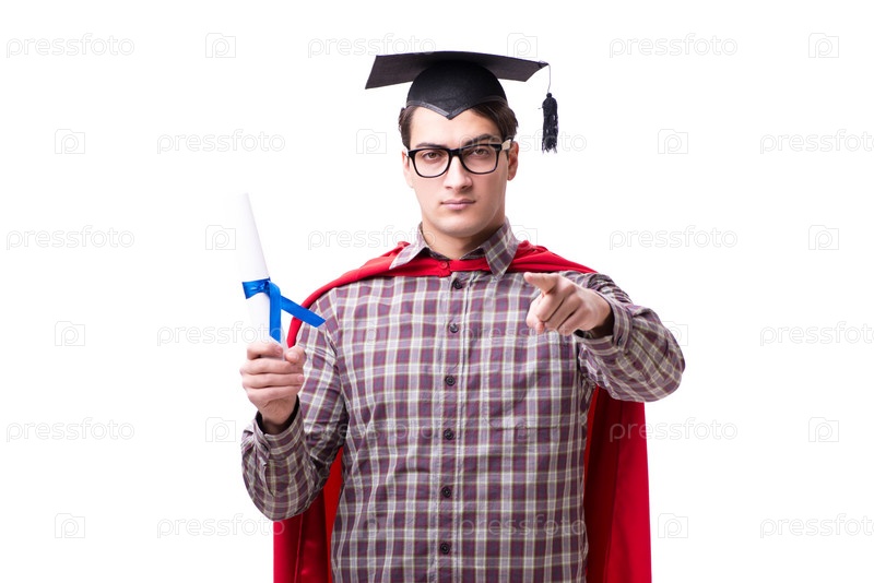 Студент-супергерой, выпускник школы, носящий минометную шапку изолированный