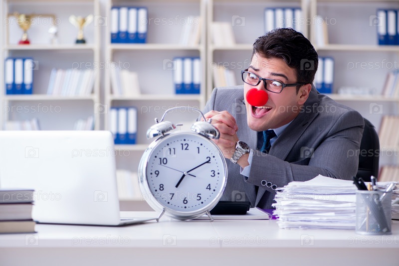 Бизнесмен-клоун с будильником, у которого отсутствует крайний срок