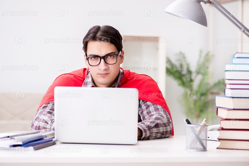 Студент-супергерой с ноутбуком учится, готовясь к экзаменам