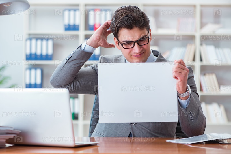 Бизнесмен в офисе, держащий пустую доску сообщений