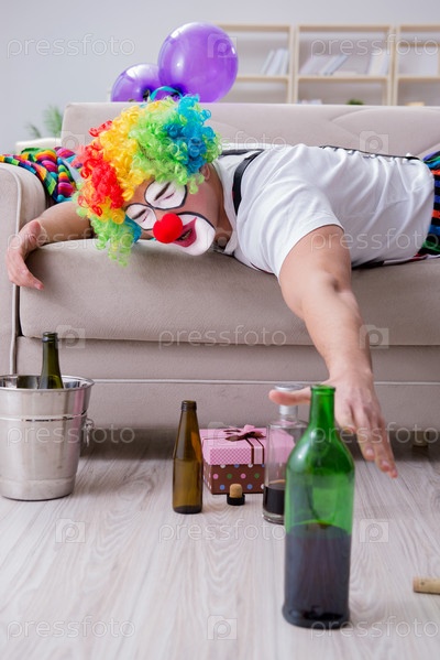 Пьяный клоун празднует, что у него дома вечеринка