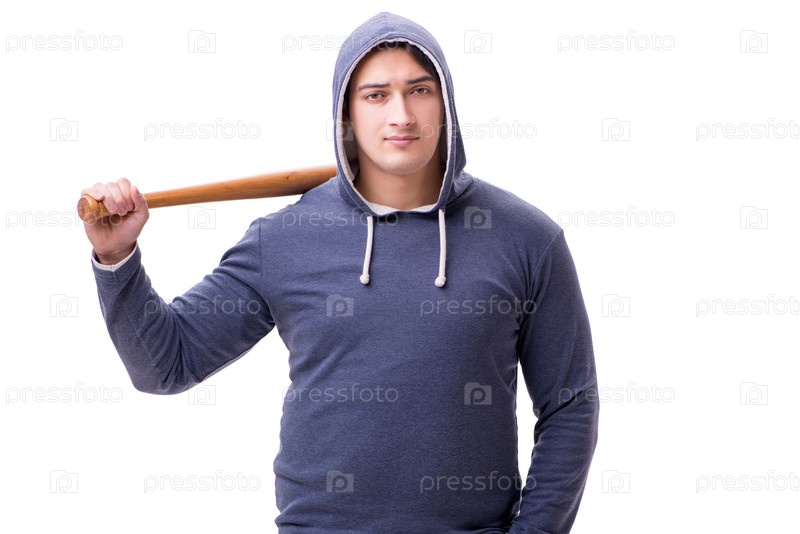 Молодой хулиган с бейсбольной битой, изолированной на белом