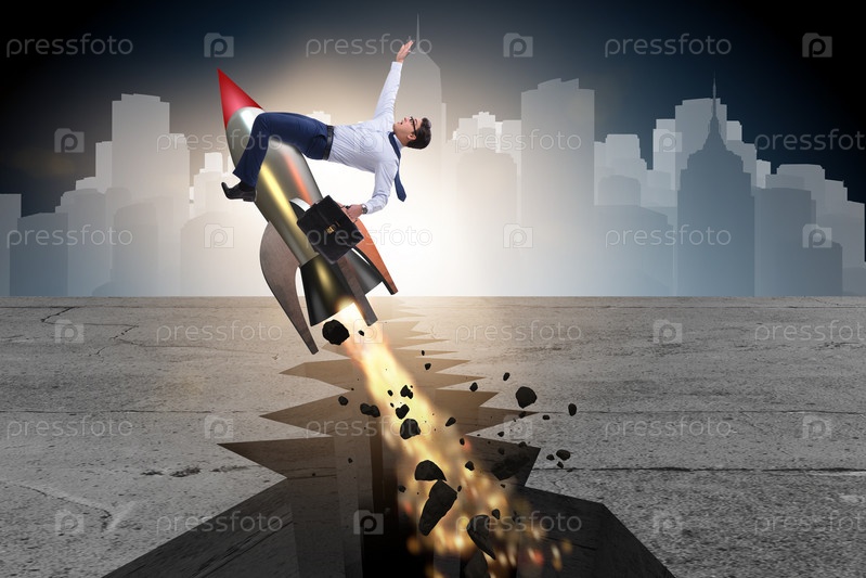 Бизнесмен, летящий на ракете из скального разрыва