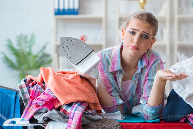 Печальная женщина гладит одежду дома