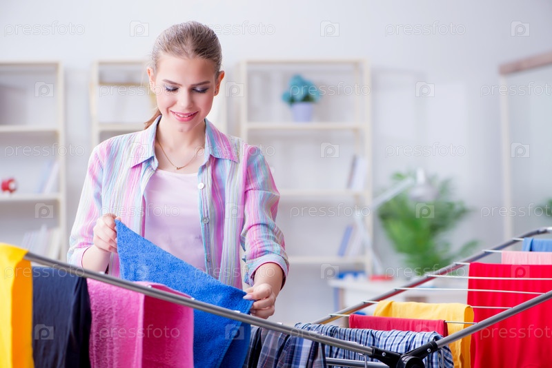 Молодая домохозяйка, стирающая бельё дома