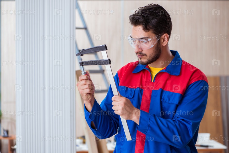 Молодой слесарь-ремонтник, работающий с зажимами