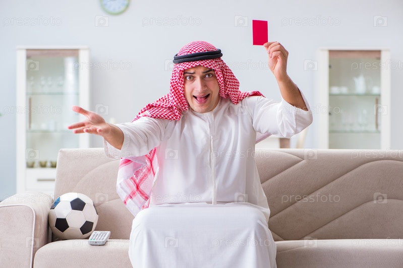 Арабский мужчина смотрит спортивный футбол по телевизору