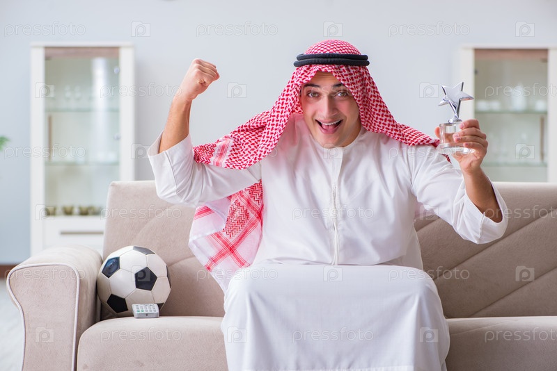 Арабский мужчина смотрит спортивный футбол по телевизору