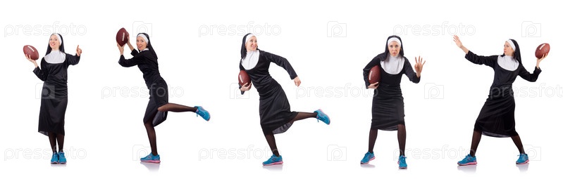 Красивая монахиня с мячом для регби, изолированным на белом