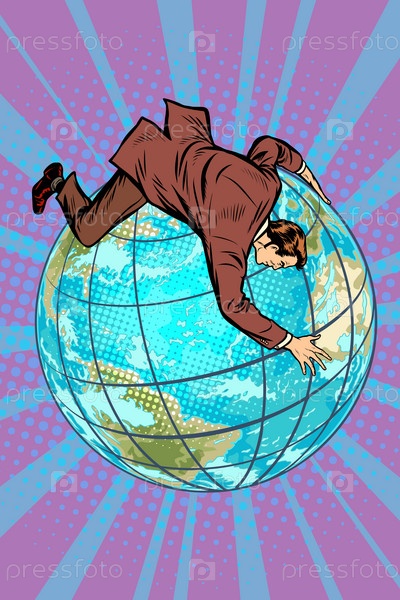 Бизнесмен падает с планеты, держится за нее