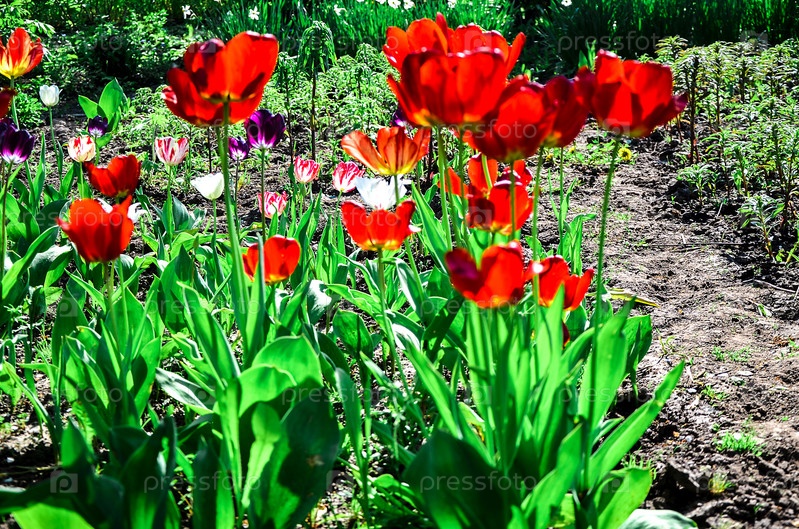 Цветущие тюльпаны на клумбе в саду весной