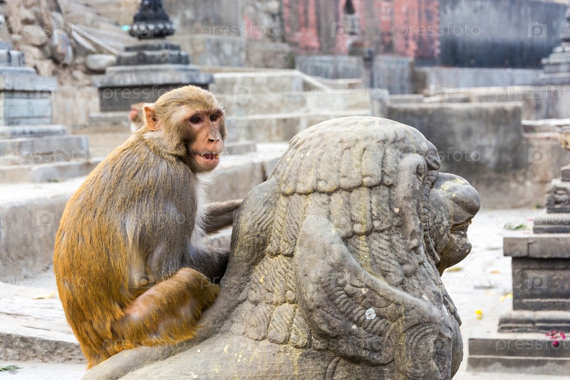 Обезьяна и каменная скульптура