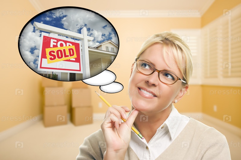 Женщина в пустой комнате думает о продаже недвижимости