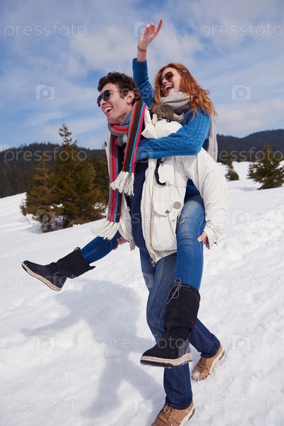 Счастливая молодая пара развлекается на свежем шоу в зимние каникулы