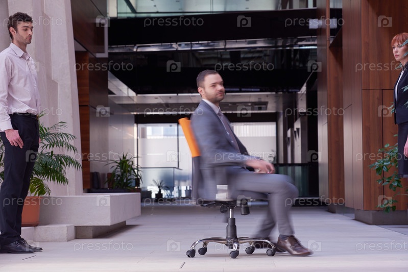 Бизнесмен сидит в офисном кресле, группа людей проходит мимо