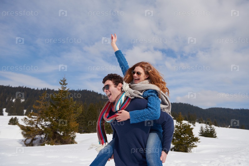 Счастливая молодая пара развлекается на свежем шоу в зимние каникулы