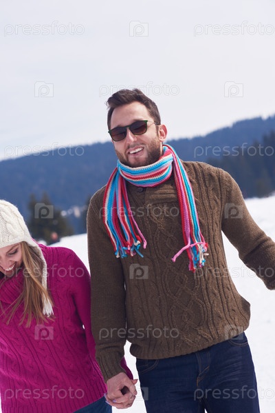 Счастливая молодая пара развлекается на свежем шоу в зимние каникулы