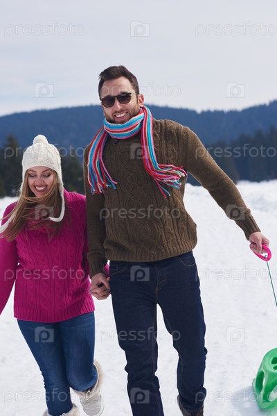 Счастливая молодая пара развлекается на свежем шоу в зимние каникулы