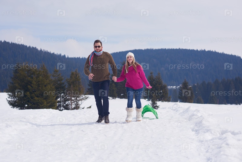 Счастливая молодая пара развлекается на свежем шоу в зимние каникулы