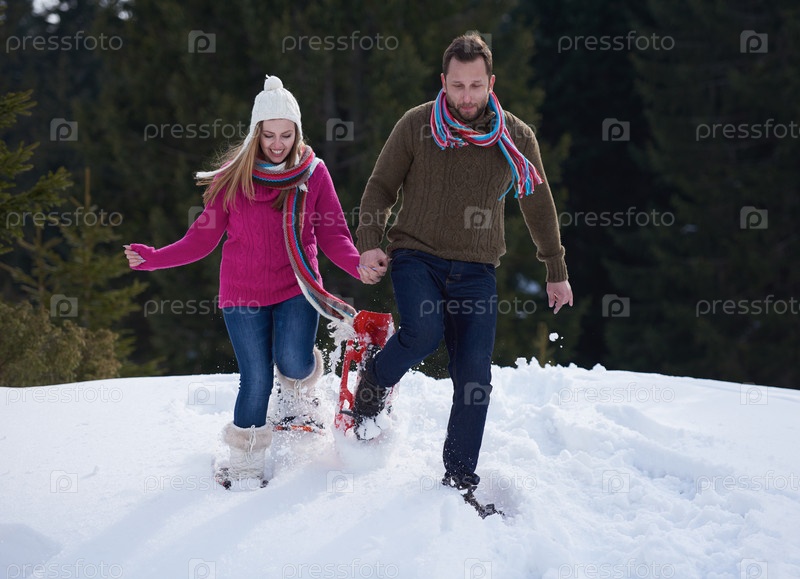 Пара развлекается и ходит в снежных ботинках