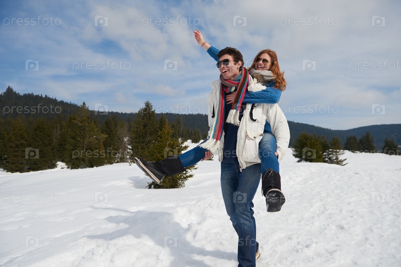 Счастливая молодая пара развлекается на свежем шоу в зимние каникулы
