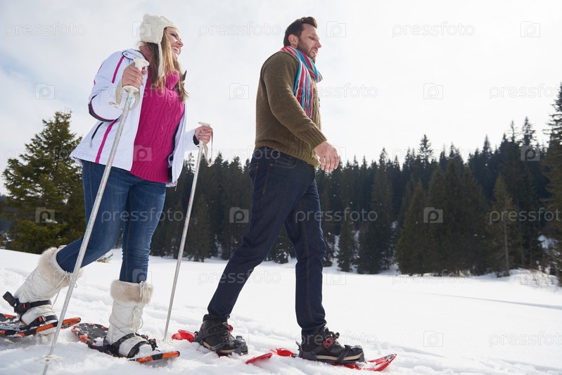 Пара развлекается и ходит в снежных ботинках