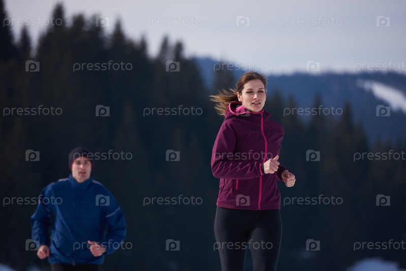 Пара бегает на улице по снегу
