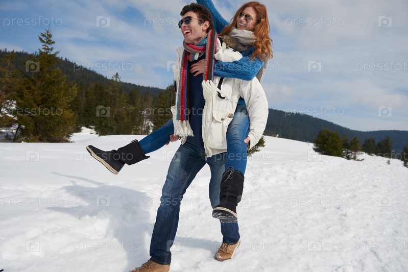 Счастливая молодая пара развлекается на свежем шоу в зимние каникулы