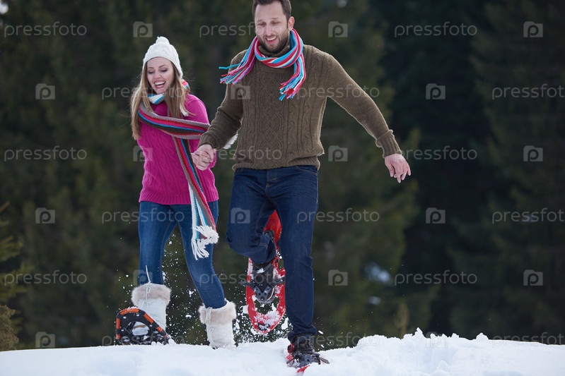 Пара развлекается и ходит в снежных ботинках