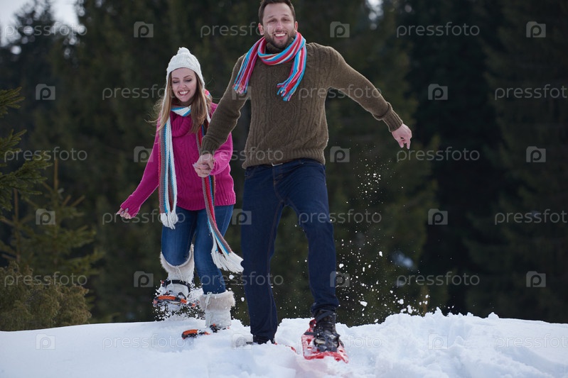 Пара развлекается и ходит в снежных ботинках