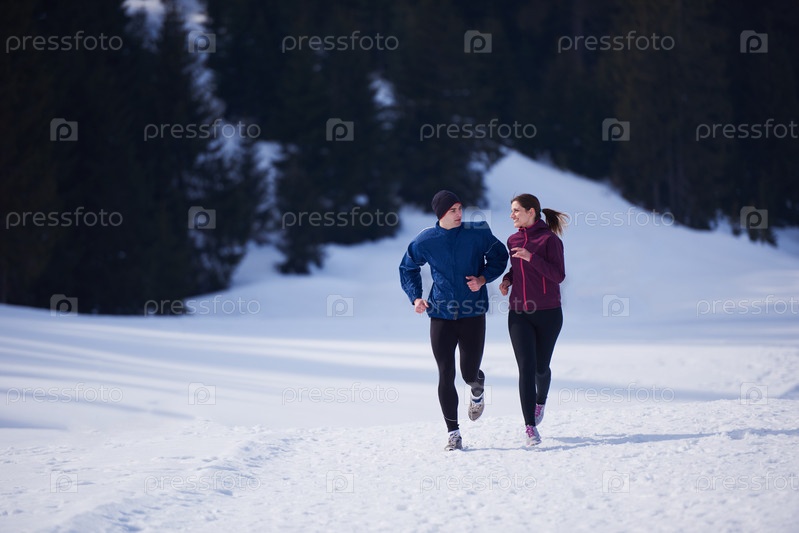 Пара бегает на улице по снегу