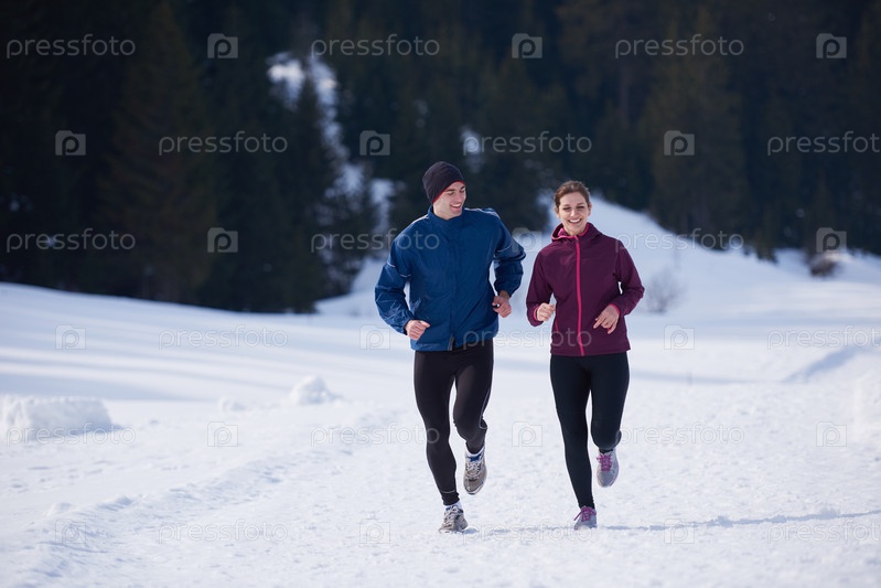 Пара бегает на улице по снегу