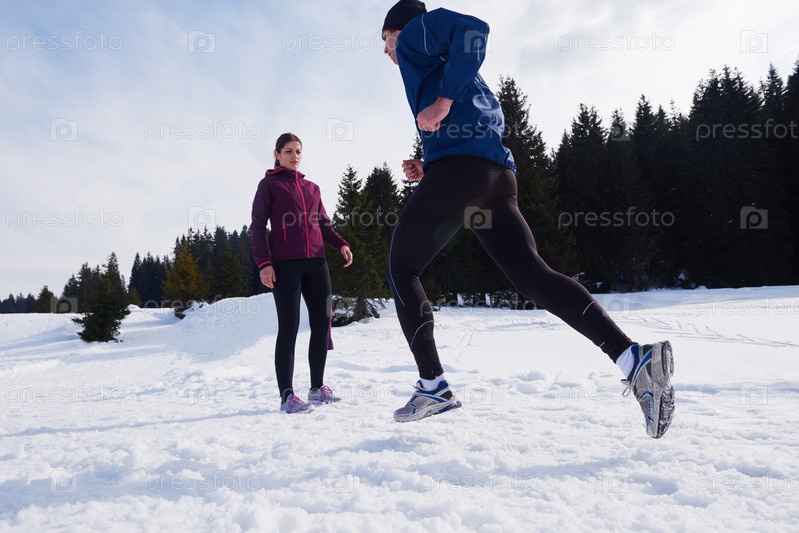 Пара бегает на улице по снегу