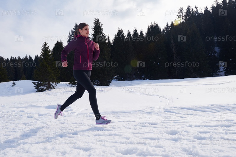 Молодая женщина бегает на улице по снегу в лесу
